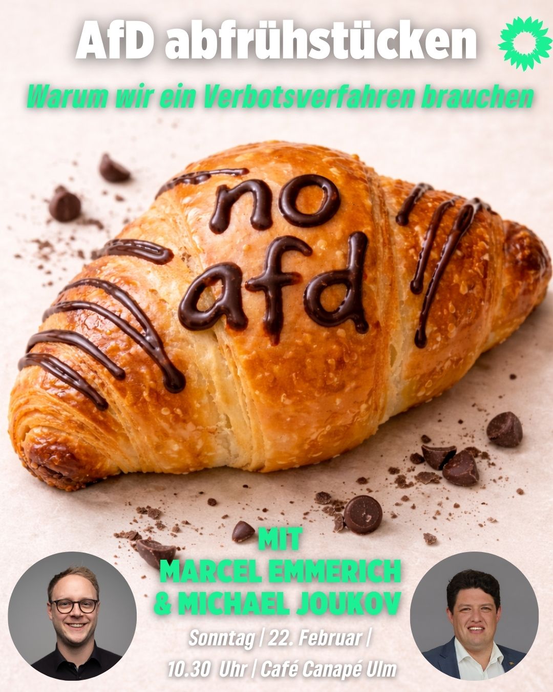 Die Diskussion um ein AfD-Verbotsverfahren ist in aller Munde - auch in unseren. Am nächsten Sonntag, 22. Februar, laden wir deshalb zu einem gemeinsamen Frühstück zum Thema ein: Ab 10.30 Uhr im Café Canapé in Ulm (Söflinger Str. 158, 89077 Ulm).